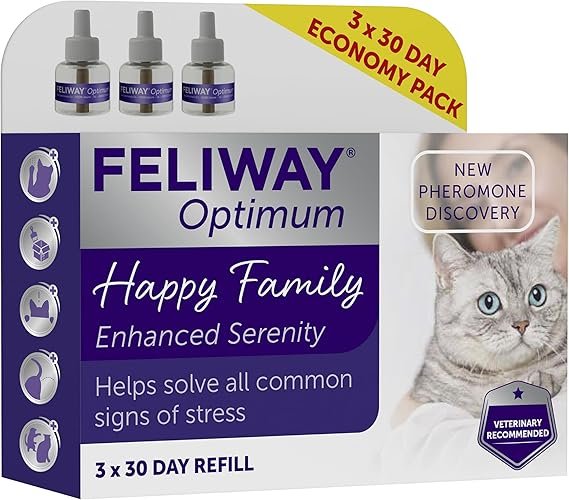 Click to see full view 4+ VIDEO Product Safety May be fatal if swallowed and enters airways. Danger May be fatal if swallowed and enters airways. Repeated exposure may cause skin dryness or cracking. FELIWAY Optimum 3×30 Day Cat Calming Odourless Refills for Pheromone Diffuser, 3x48ml Value Pack – Helps Solve Signs of Stress in Cats & Kittens, Veterinary Recommended, Drug-free, Clinically Proven